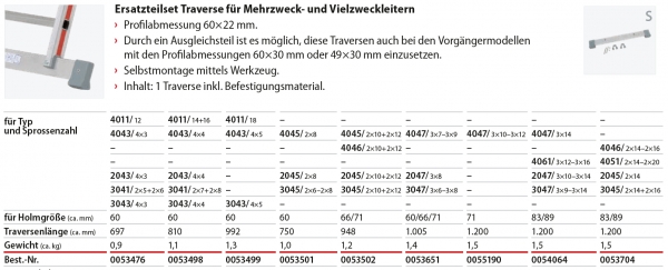 Hymer Zubehör/Ersatzteile - Ersatzteilset Traverse für Mehrzweck- und Vielzweckleitern, Länge 948mm