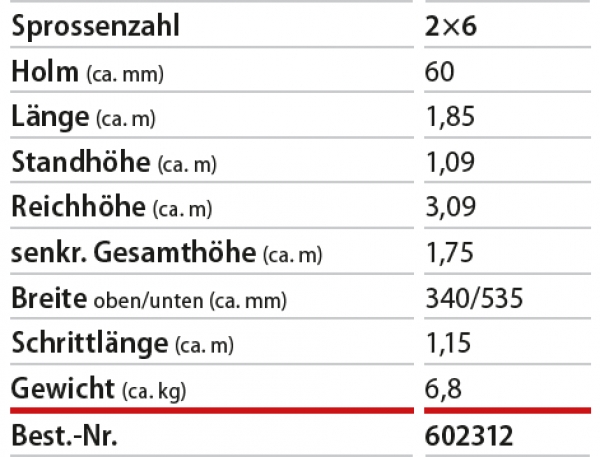 Hymer 6023 Sprossenstehleiter, beidseitig begehbar 2x6 Sprossen, Reichhöhe ca. m: 3,09
