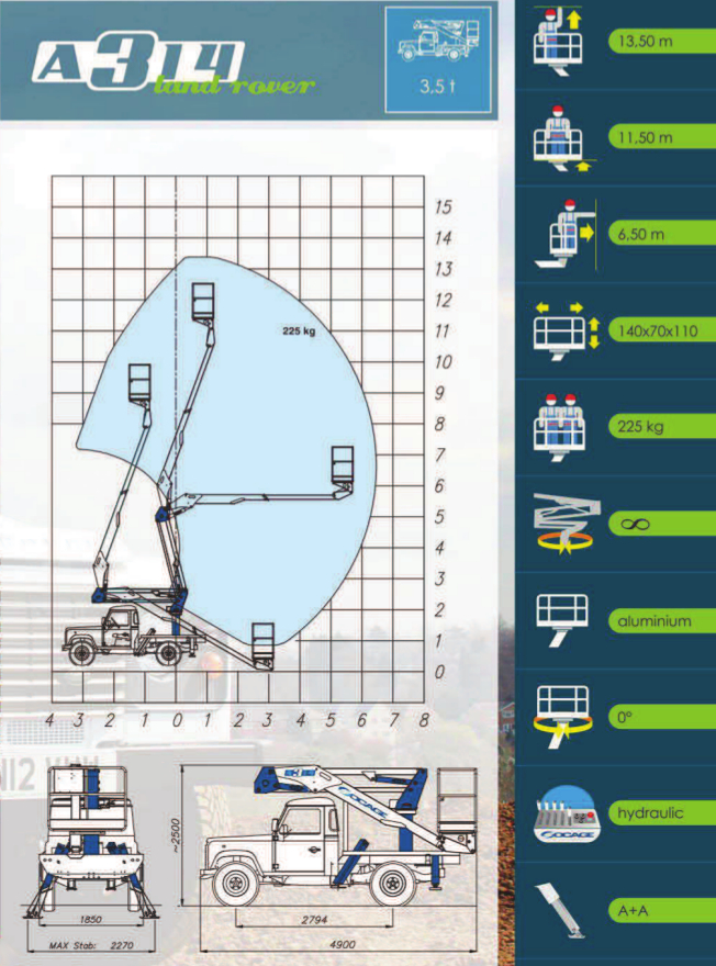 Sie erreicht eine maximale Arbeitshöhe von 13,5 m und eine maximale Arbeitsreichweite von 6,5 m.